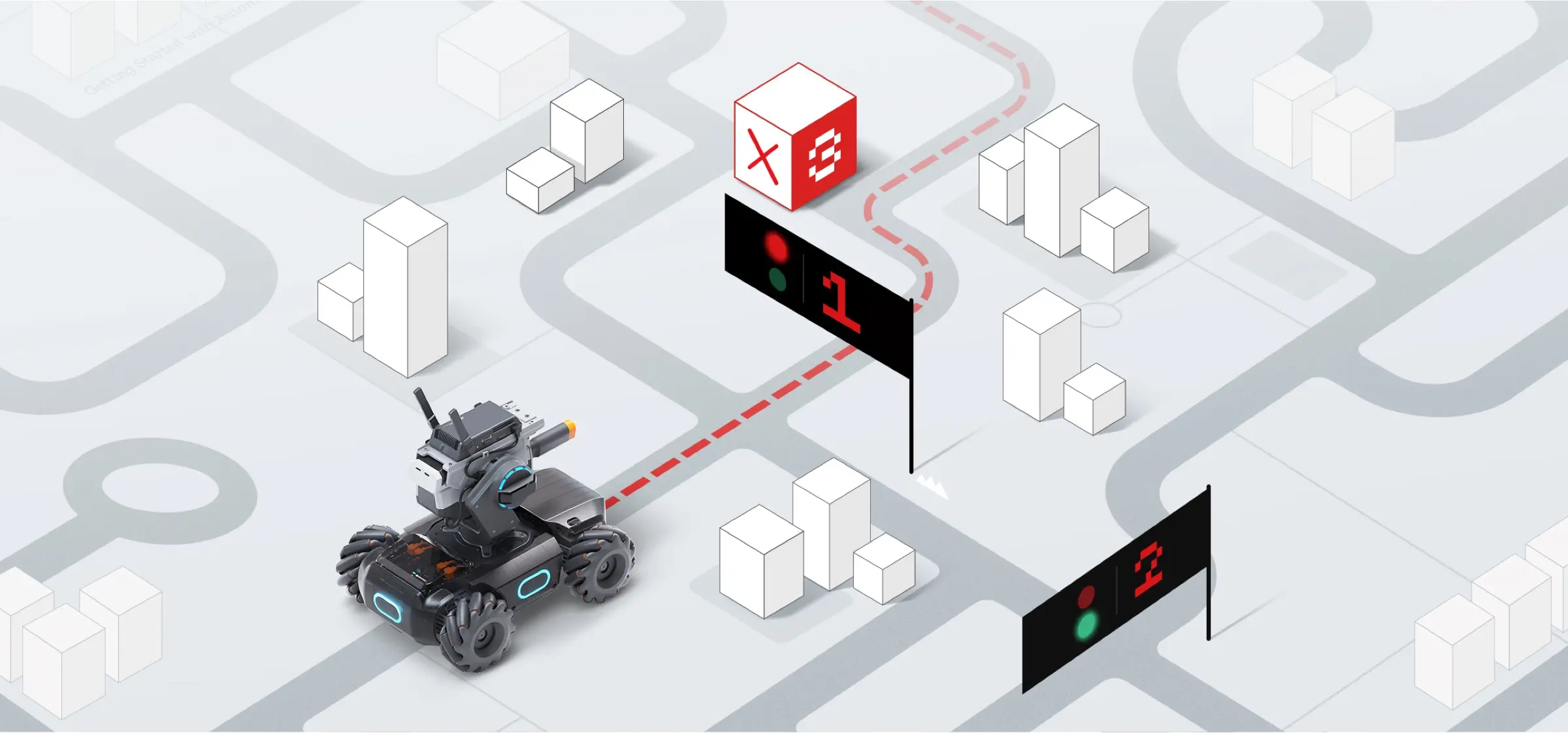 使用视觉标签定义“红绿灯”和“障碍物”,实践机器人控制、力学等数理知识,运用六类人工智能模块,编写专属的自动驾驶算法程序,驱动机甲大师 S1 自主穿越复杂道路完成任务!深入理解人工智能技术,智能时代,不落人后。